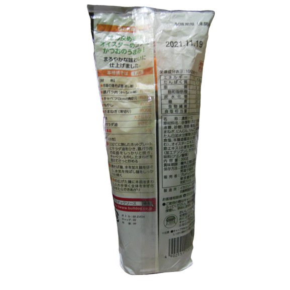 Ingredients: Worcester sauce, vegetables and fruits (tomato, spring onion, apple,) saccharides (sugar, glucose fructose syrup), brewed vinegar, salt, soy sauce (wheat, soy bean), liquid amino acid, seasoning, oyster extract (mollusc), meat extract, powdered soy sauce (wheat, soy bean), kombu kelp seaweed, yeast extract, thickener (modified starch, tamarind), caramel colouring, seasoning (amino acid)