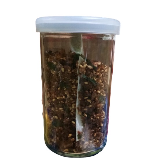 Furikake is a dry Japanese condiment meant to be sprinkled on top of rice. It typically consists of a mixture of dried and ground fish, sesame seeds, chopped seaweed, sugar, salt, and monosodium glutamate. Other flavorful ingredients such as katsuobushi (sometimes indicated on the package as bonito), or okaka (bonito flakes moistened with soy sauce and dried again), freeze-dried salmon particles, shiso, egg, powdered miso, vegetables, etc., are often added to the mix.