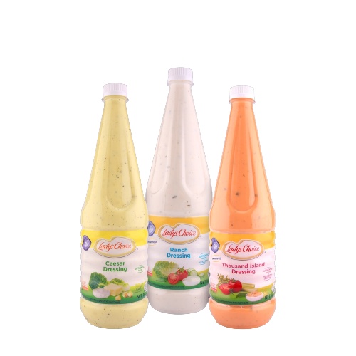 LADY’S CHOICE Caesar Salad Dressing 1L Made with anchovy, eggs and finished with a hint of traditional spice. Ideal for salads, wraps and burgers. Lady’s Choice Thousand Island Dressing is tangy and combines the best ingredients of real tomato paste and chunky gherkins relish.