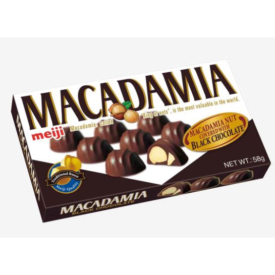 Real pieces of selected macadamia nuts are covered with a rich and buttery chocolate from Meiji Japan.